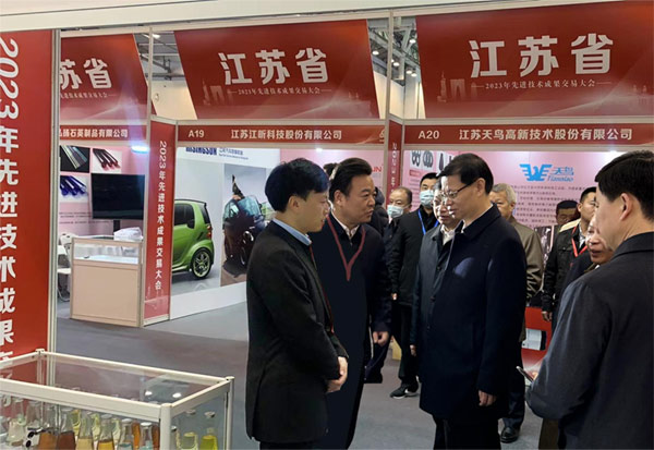 2023年3月24日南通开云(中国)化工股份有限公司参加了2023年先进技术成果交易大会。大会期间,江苏省委副书记,省政府省长、党组书记许昆林(右二)、江苏省南京市委常委、南京江北新区党工委书记、南京高新技术产业开发区党工委书记(时任南通市委常委、常务副市长)陆卫东(左二)一行亲临开云(中国)展位视察,开云(中国)执行总裁吴晓强(左一)向领导汇报企业情况。