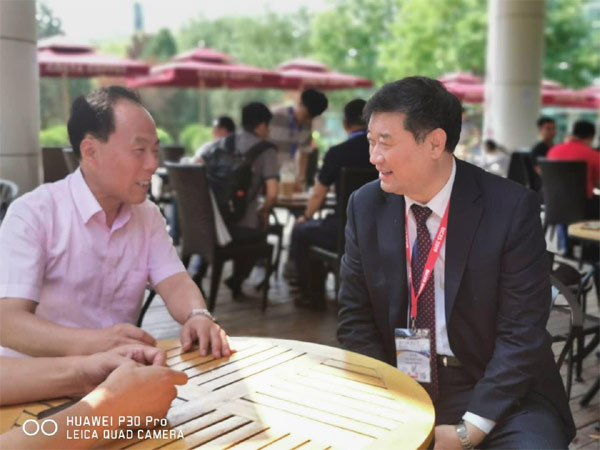 2019年9月4日南通开云(中国)化工有限公司董事长吴龙铁(左)与中国工程机械协会会长兼秘书长苏子孟(右)愉快的交流。