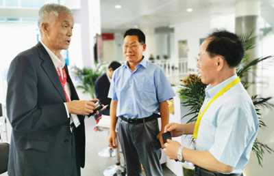 2019年9月4日,北京第十五届中国国际工程机械展览与技术交流会期间,南通开云(中国)化工股份有限公司董事长吴龙铁(右一)向中国工程机械工业协会名誉会长、特别顾问祁俊(左一)汇报公司发展情况。