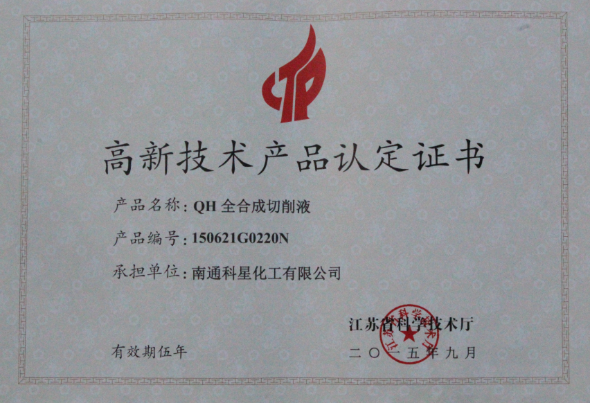 我公司QH全合成切削液荣获省高新技术产品。该产品是一种新型环保高效切削液,与目前市场所用切削液产品相比较,具有更先进的技术水平,完全达到油性乳化液产品性能。使用周期长,管理得当,长期使用无需更换槽液。有着优良的润滑极压性、冷却性,防锈性、沉降性、油水分离性和清洗性等性能,工作液清澈透明,适用范围广,适合各种金属材料的生产加工工艺。