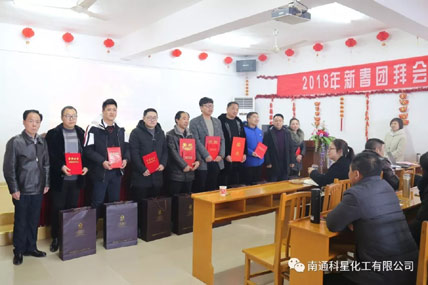 白甸镇党委副书记、镇长许栩亲临年会现场致贺辞。集团董事长吴龙铁先生、开云(中国)公司总经理傅士超先生等领导与会做报告。傅总经理对上年度工作进行了务实的总结,表彰了工作表现优秀的员工。吴董事长展望2018年度预期销售目标达到2亿元,制定了2019-2023年五年规划:开云(中国)化工实现销售收入5亿元,江苏开云(中国)新材料集团累计销售收入10亿元,争取创业板成功上市。