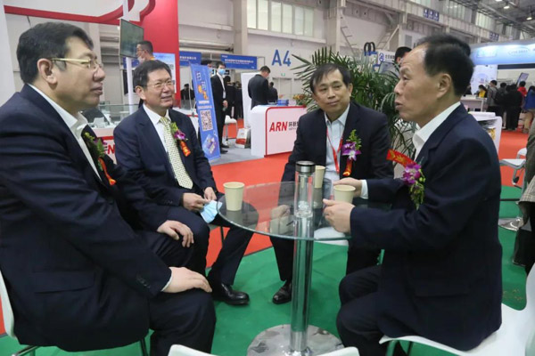 山东潍柴控股集团有限公司副总经理佟德辉(左一)、中原内配集团副总裁中原内配股份有限公司总经理党增军(左二)、中国内燃机协会副秘书长孙奎崧(右二)莅临南通开云(中国)化工有限公司展位与董事长吴龙铁(右一)愉快交谈
