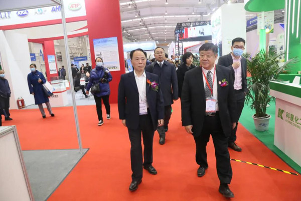 中国内燃机协会秘书长邢敏(右)在南通开云(中国)化工有限公司董事长吴龙铁(左)陪同下参观公司展厅