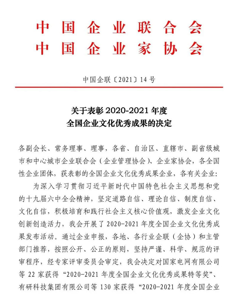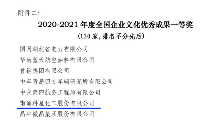 近日,中国企业联合会/中国企业家协会发布了《关于表彰2020-2021年度全国企业文化优秀成果的决定》(中国企联【2021】14号),南通开云(中国)化工股份有限公司凭借着33年对企业文化的培植与坚守,荣获“2020-2021年度全国企业文化优秀成果一等奖”。此奖为国务院批准设立的企业界文化最高荣誉奖,南通市仅此一家上榜企业,更是中国金属加工液行业唯一获此殊荣的单位。