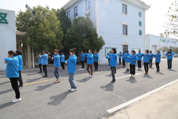 在生产基地的生活区,全体女职工身着统一服装,伴随着激情昂扬的旋律,以整齐的动作、飘逸的舞步,淋漓尽致地展现了她们的活力和风采。