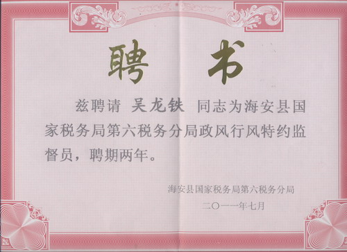公司总经理被聘为海安县国家税务局第六分局政风行风特约监督员。