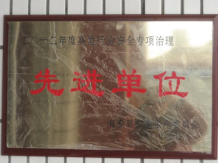 我公司被海安县安全生产委员会评为《二0一二年度高危行业安全专项治理先进单位》。