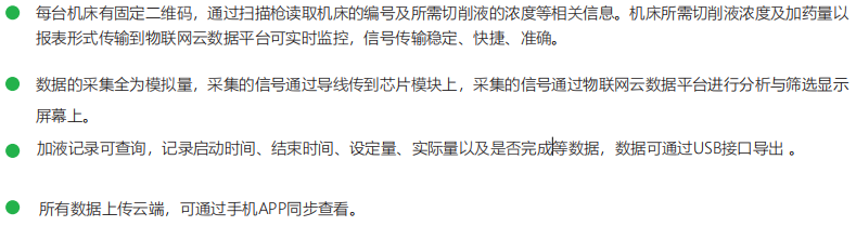 本系统通过扫码枪读取机床标号及所需要切削液数量等信息,系统定量给机床添加工作液并记录时间,数量等数据,同时保存数据并上传,本系统可移动、性能可靠、显示直观、操作简单。