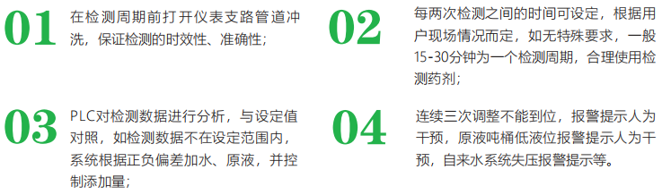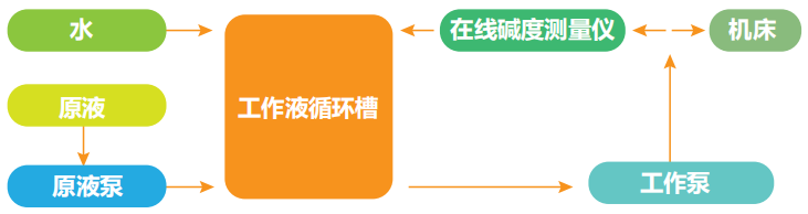 游离碱是切削液中的储备碱,是切削液使用过程中有效浓度的重要指标,在线碱度自动滴定测量仪,安装在集中供液管线上,周期性对工作液碱度进行检测,PLC系统可以根据检测结果对浓度进行适度跟踪、调整,使得工作液始终在目标范围内。